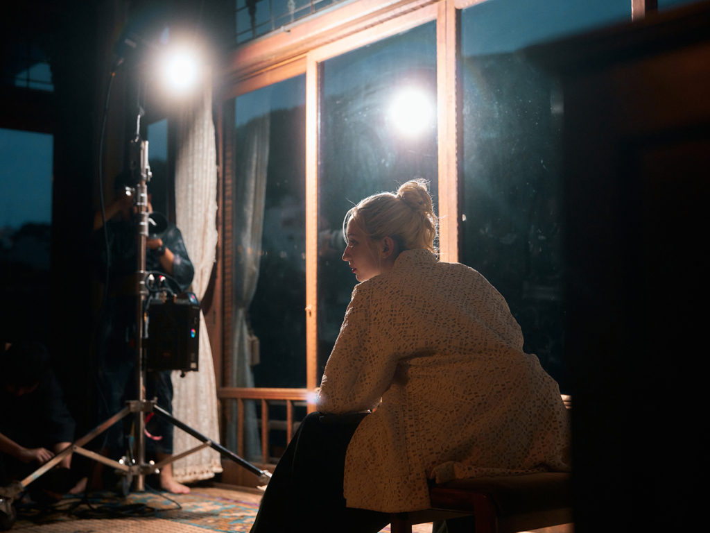 Three locations within Kiunkaku were used: the grand hall with the Japanese garden as backdrop, the garden facing the wooden Japanese residence, and an atmospheric tatami room.
